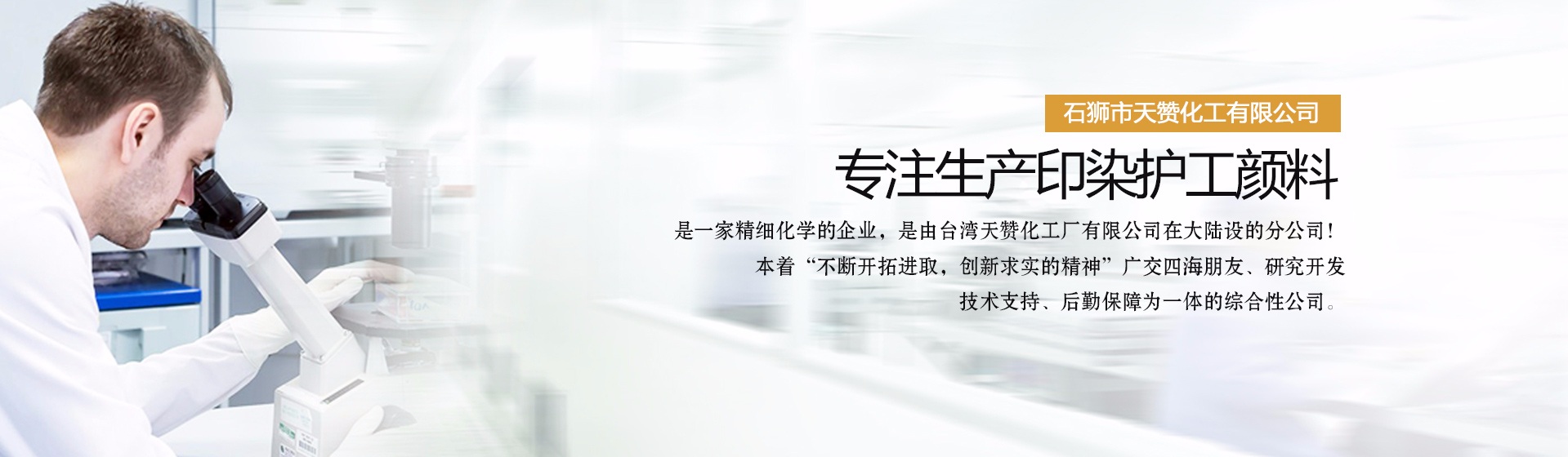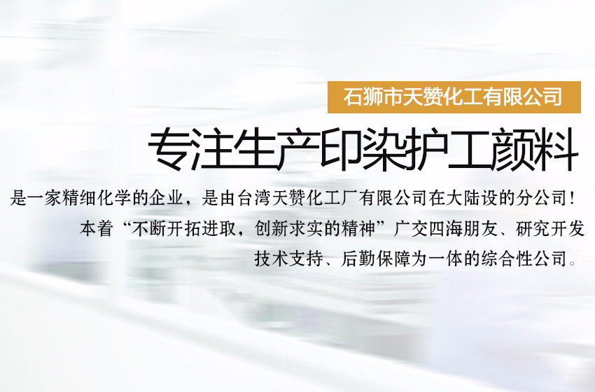 石獅市天贊化工有限公司是一家生產(chǎn)印染護工顏料的公司,是一家精細化學的企業(yè),是由臺灣天贊化工廠有限公司。在大陸設的分公司!本著“不斷開拓進取,創(chuàng)新求實的精神”廣交四海朋友、研究開發(fā)、技術支持、后勤保障為一體的綜合性公司。二十年來,我們對紡織,前處理,后整理,技術的研究實踐中體會得經(jīng)驗。